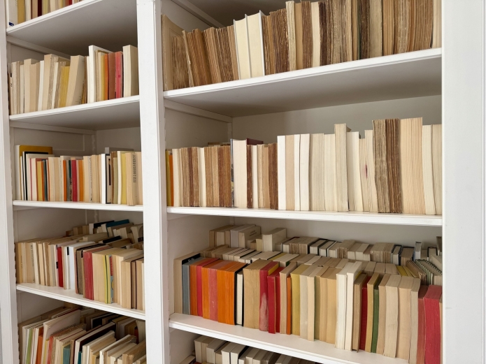 À la Maison des Écritures de la ville, la salle-bibliothèque affiche un étrange paysage : les livres semblent punis, inversés, comme pour ne pas dévoiler leur face cachée